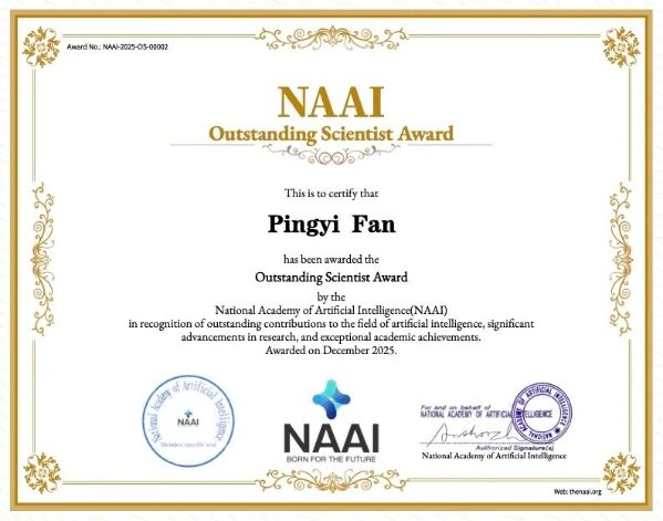 Fan Pingyi, a tenured professor in the Department of Electronic Engineering at Tsinghua University, has been awarded the Outstanding Scientist Award by the U.S. National Academy of Artificial Intelligence (NAAI).